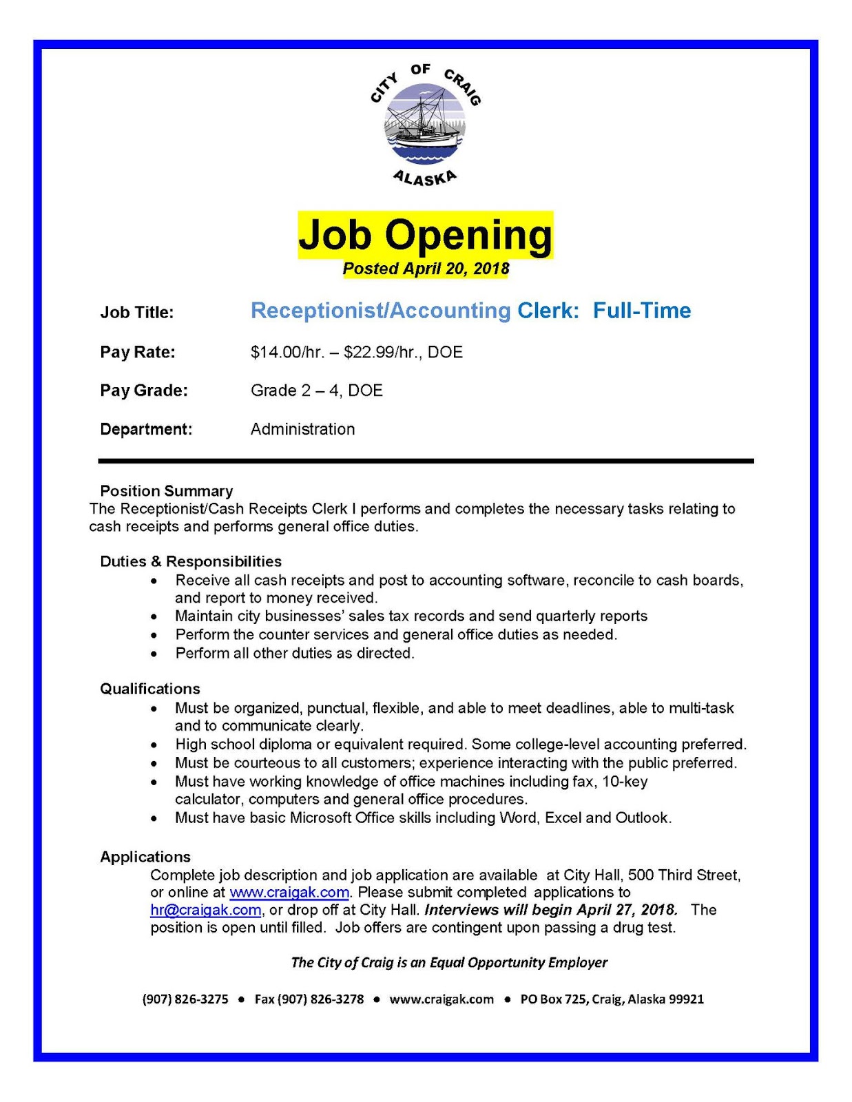 Job Posting Craig Receptionist Accounting Clerk P O W Report. 4,514 accounting clerk jobs found. Indeed ranks job ads based on a combination of employer bids and relevance. An accounting clerk is a member of a company's accounting department, responsible for assisting with both clerical and administrative tasks. Typing accurately, preparing and maintaining accounting documents and records. Preparing bank deposits, general ledger postings and statements. Indeed may be compensated by these employers, helping keep indeed free for jobseekers. Displayed here are job ads that match your query. In general, an accounting clerk takes care of basic office tasks that involve reporting, bookkeeping, research, as well as the resolution of discrepancies. Search careerbuilder for accounting clerk jobs and browse our platform. Providing accounting and clerical assistance to the accounting department. These accounting interview questions will help you. Get fresh accounting clerk jobs daily straight to your inbox! Apply now for jobs that are hiring near you. Preparing for a job interview? Page 1 of 7,362 jobs.