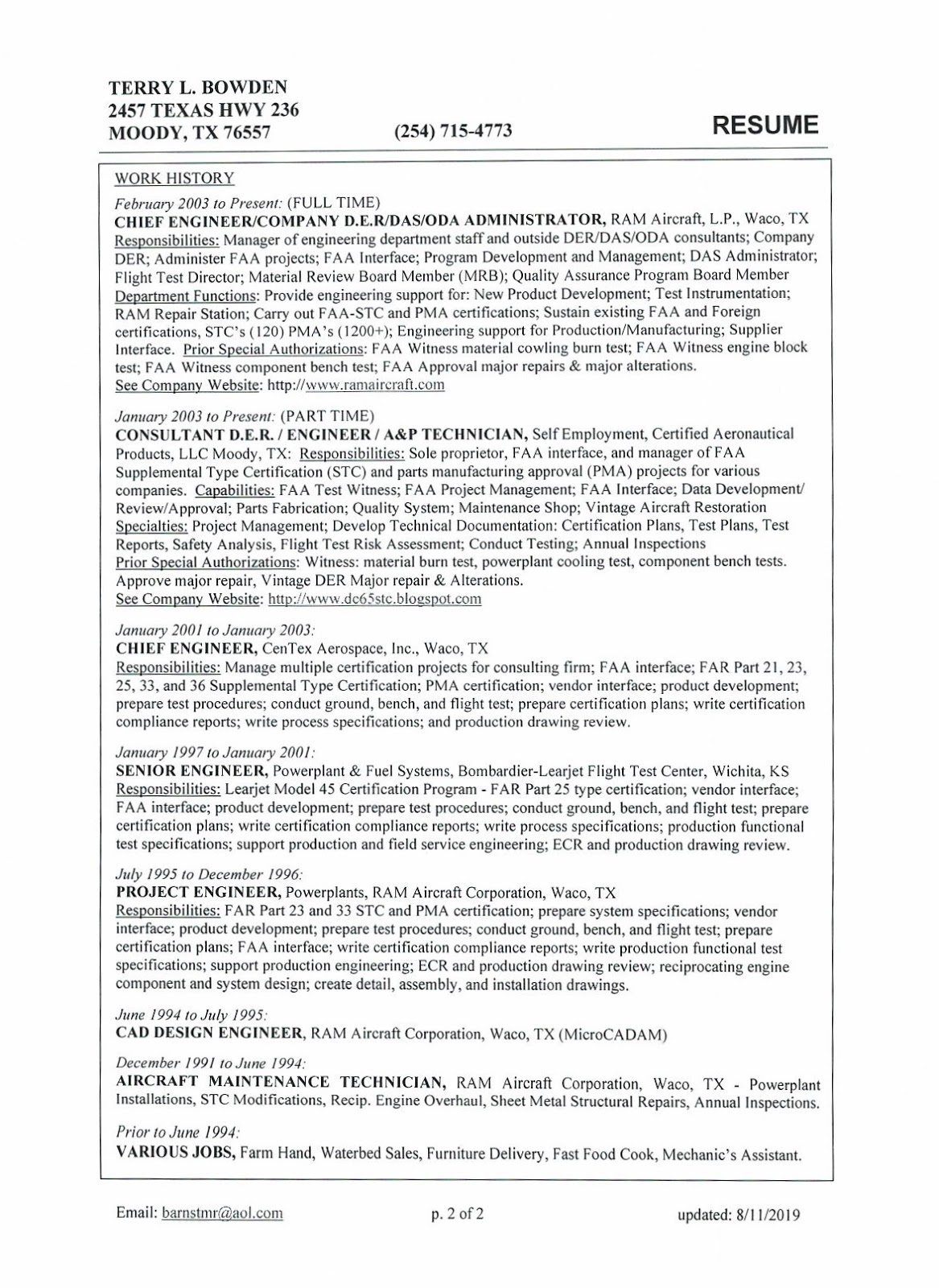 Terry Bowden Consultant Der Resume , All Mechanic Tests Including General, Airframe, And Powerplant.