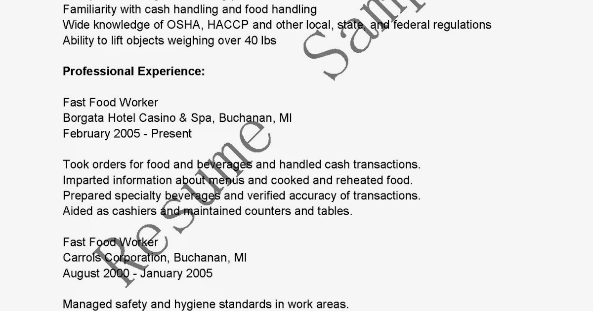 Tgwu6qkjz7xwsm. Customer service professional with 12 years experience interacting with the public. Able to work independently or as a member of a fast food service team. Being clear and to the point is the key to grabbing the attention of hiring managers. Highly focused and hardworking fast food worker with a stellar work ethic and outstanding customer service history. View hundreds of fast food worker resume examples to learn the best format, verbs, and fonts to use. Fast food worker resume vocabulary & writing tips. 20+ actionable examples and expert tips. The job duty may vary as per assigned task; Use our fast food resume sample and template. Find briefed fast food worker job description and traits important for a fast food restaurant worker. Flexible shifts and a good chance of getting a promotion. With our fast food worker resume example it's all within reach. A guide to writing a resume for fast food worker. Fast food workers serve customers in dining establishments and may also be responsible for preparing food. Also refer to a free sample resume at the end of the fast food workers are the people executing the routine activities at a fast food restaurant.