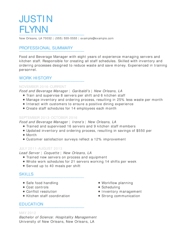 Food Services Manager Resume Examples Writing Tips 2020 Free Guide Resume Io. Summary statements for food & beverage professional. Food and beverage manager/chef resume. Energetic hospitality professional with over 15 years in the restaurant industry and over 8 years in hotel properties. Complete all administrative requirements and reports. Find the best food and beverage manager resume examples to help you improve your own resume. Highlights guest services communicates effectively service oriented event planning listening skills concierge duties staff. Bringing talents in developing and implementing an inviting environment for guests and visitors to ensure a distinctive food and beverage experience. • desire a food and beverage manager position at doubletree hotel. Highly effective food and beverage director with almost 15 years of experience specializing in generating sales revenue increase, food and spirits management. Sample objectives for food and beverage manager resume. Works with doubletree management team to meet budgetary goals. Food & beverage manager resume examples & samples. Prepares for and ensures the successful execution of banquet and conference events. Do you want an outstanding food and beverage manager resume ? View hundreds of food and beverage manager resume examples to learn the best format, verbs, and fonts to use.