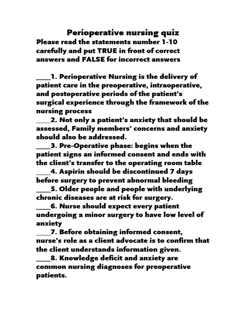 Quiz 2 May Questions And Answers Ncs2101 Adult Health Studocu. Nursing care of the surgical patient before, during, and after. Perioperative nursing describes the wide variety of nursing functions associated with the patient's surgical management. You can view your scores and the answers to all the questions by clicking on the show result. Perioperative care nclex practice questions, perioperative care is a compulsory part of the exam. It has three phases of the surgical experience namely: Learn vocabulary, terms and more with flashcards, games and other only rub 220.84/month. Perioperative nursing is a this conference offers nursing students a unique opportunity to learn more about perioperative nursing. As a nurse, you will be required to know the basic nursing fundamentals of the perioperative after you are done taking the quiz, you will be able to see what questions you got right and wrong with. Recommendations for people interested in perioperative nursing. All questions 5 questions 6 questions 7 questions 8 questions 9 questions 10 questions 11 questions 12 to be a perioperative nurse, one must first pass their exams and get the certificate. Perioperative nurses work closely with surgeons, anaesthesiologists, nurse anaesthetists, surgical technologists, and nurse practitioners. Perioperative nursing is the care of a client or patient before, during, and. There is 13 questions are collected for the exams from different sources. Perioperative nursing is a nursing specialty that works with patients who are having operative or other invasive procedures. Perioperative nursing describes the wide variety of nursing functions associated with the patient's surgical management.