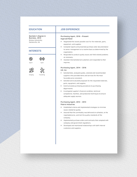 Purchase Agent Resume Purchasing Agent Resume Example. It means you have to write your resume and focus. There are plenty of opportunities to land a purchasing agent job position, but it won't just be handed to you. Looking for cover letter ideas? Purchasing agent resume samples with headline, objective statement, description and skills examples. Purchasing agent resume sample inspires you with ideas and examples of what do you put in the objective, skills, responsibilities and duties. Purchasing agent resume examples & samples. Purchasing agents ensure that the materials needed for the functioning of the company are adequately stocked. Purchasing agent with 11 years of purchasing and procurement experience and a solid background in manufacturing or a production environment. Are you working as a purchasing agent and you are ready to change careers and apply for a new job? A purchasing agent must have experience of procuring materials and services for projects as displayed in this sample resume. See our sample purchasing agent cover letter. Find out what is the best resume for you in our ultimate resume. Crafting a purchasing agent resume that. Executes full spectrum of request for proposal (rfp) activities for complex goods and services, including rfp development, vendor identification, data analysis, evaluation, negotiation, selection, and contract creation. Purchasing agents are in charge for buying the products and materials a company needs to run its activity.