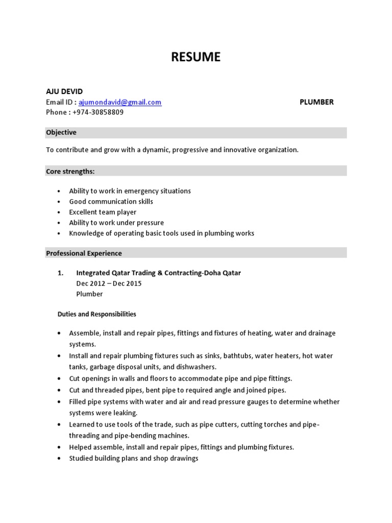 Resume Of A Plumber Www Jrudolph Com : Precisely follows directions and works.